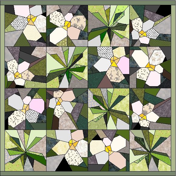 Не сложная в исполнении схема квилта с цветочными блоками, которые можно видоизменять по своему усмотрению. Напоминает витраж и фриформ, позволяет пристроить маленькие лоскутки, поскольку каждый отдельный сектор блока тоже может состоять из более мелких фрагментов. »