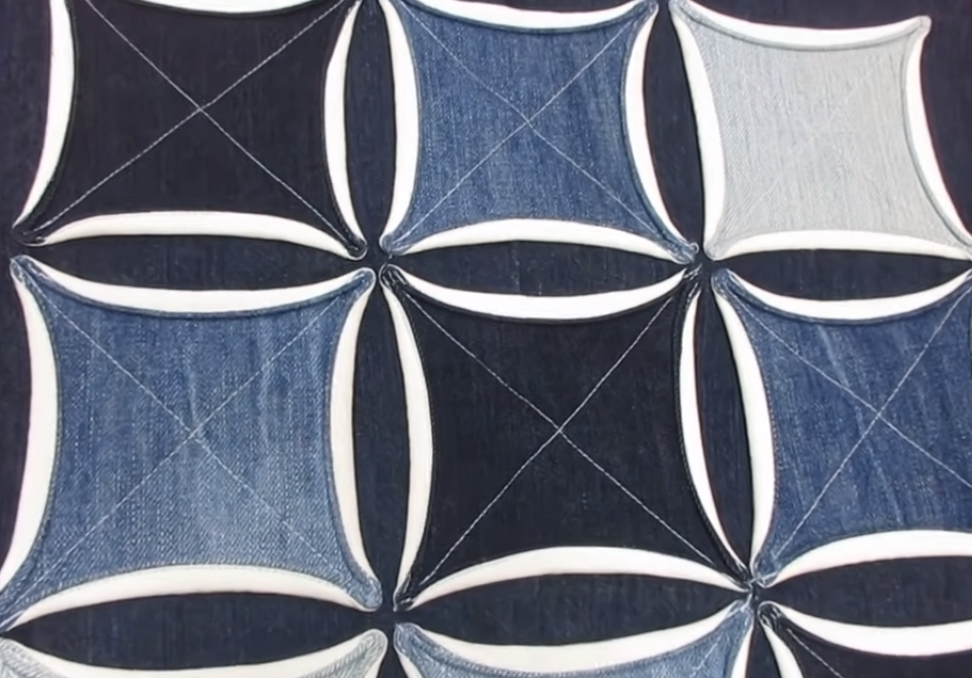 Еще один способ сборки блока Кафедральное Окно совсем прост. К тому же он выполняется на ровной основе из цельного куска ткани без швов, а это позволяет сделать изделие более тонким. Секрет его в том, что мы сшиваем друг с другом квадраты из цветной и однотонной ткани, накладываем их на цельную основу и простегиваем по диагоналям, а затем выворачиваем края квадратов и подшиваем их, как в обычном способе. Этот вариант пригодился для джинсовой сумки, создание которой можно увидеть полностью в видео.